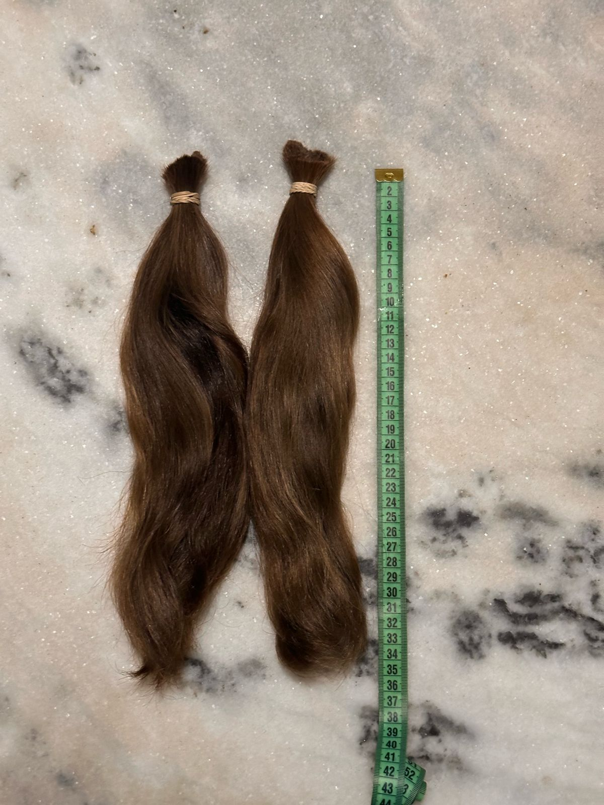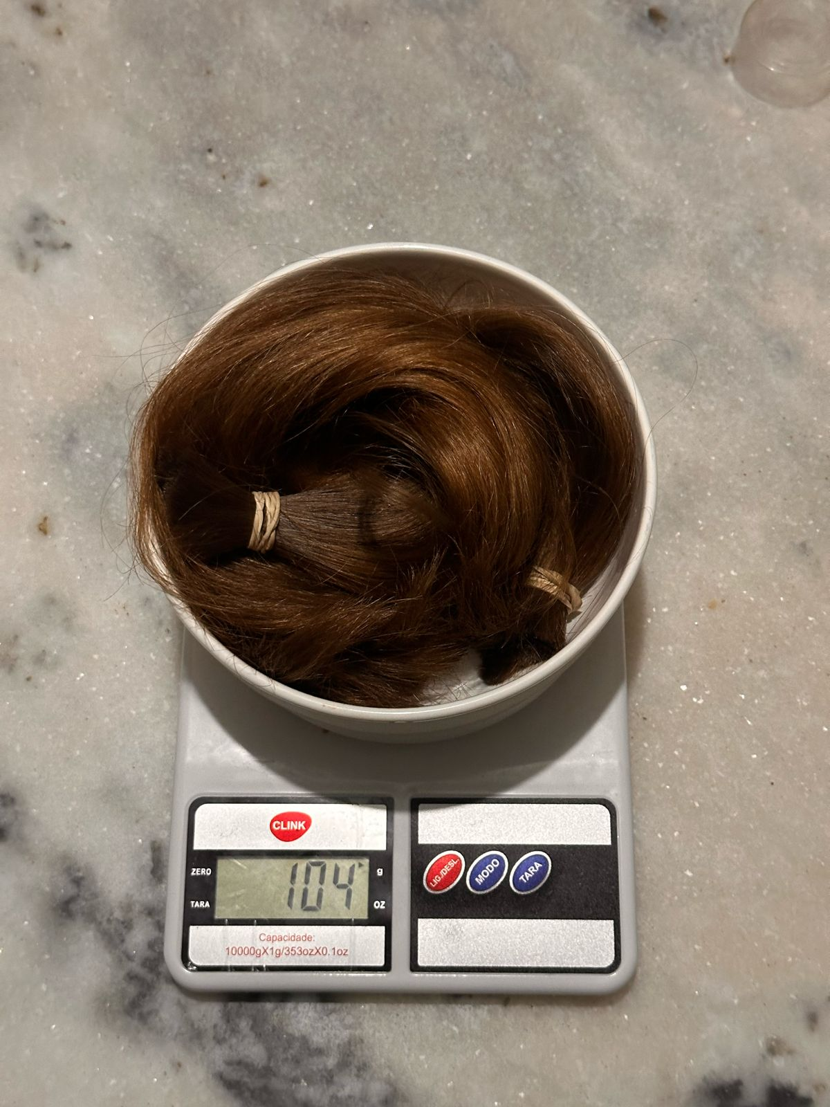 Cabelo liso com leve ondulação, sem química. Loiro escuro. Mais de 100 gramas de cabelo.